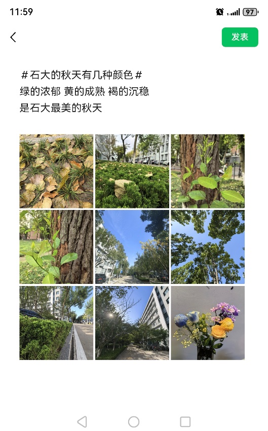请参赛同学将作品以#石大的秋天有几种颜色#为话题标签在微信朋友圈或QQ空间以四宫格或九宫格形式发布后(发布范例见下图),将朋友圈/QQ空间截图+照片原图+配文,以“研究生秋日摄影征集+姓名”为邮件主题,发送至指定邮箱:1598958732@qq.com