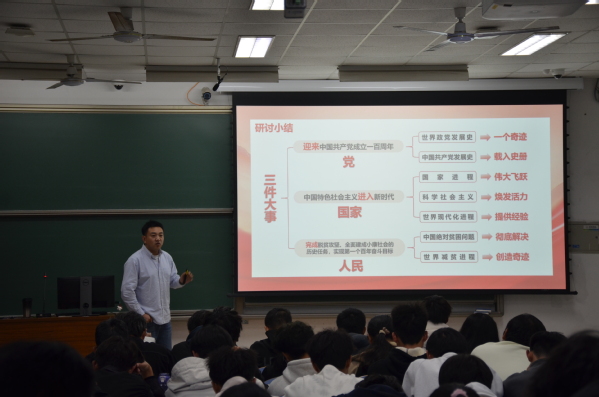 王鹏翔老师讲解三个胜利 冯涛摄活动伊始,王鹏翔以“人生大事” 为切入点开始演讲,幽默地询问大家心中的重要目标。现场氛围轻松热烈。王鹏翔顺势引出:“对个人而言,这些是人生大事;对中国共产党和国家来说,近十年也完成了三件影响深远的大事。” 随后清晰阐释了 “迎来中国共产党一百周年诞辰、中国特色社会主义进入新时代、完成脱贫攻坚全面建成小康社会实现第一个百年奋斗目标” 的核心内涵,直观感受到个人发展与国家命运的紧密联系。