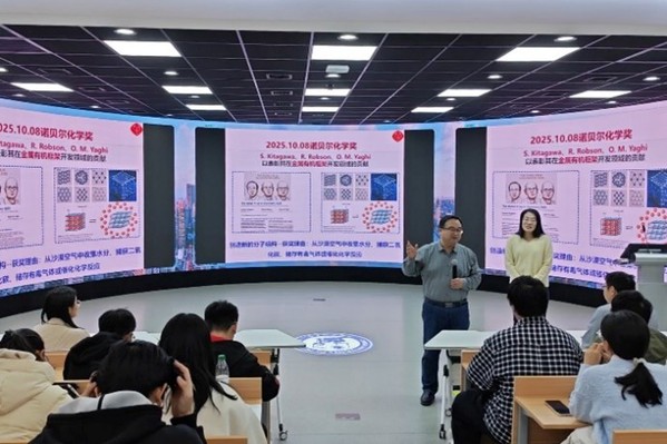 11月23日,yl6809永利检测中心材料科学与工程学院戴昉纳教授做题《解码诺奖·启迪思维——2025年诺贝尔化学奖深度解读》的“拔尖论坛”第一期学术讲座。本次讲座由yl6809永利YL集团与荟萃学院联合主办,在南教209全景教室举行,化学系卢玉坤教授主持。