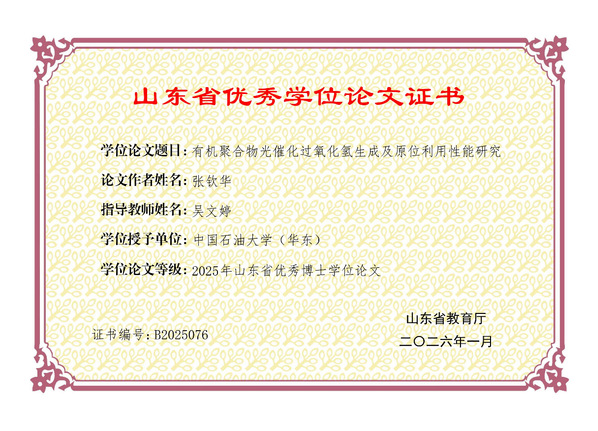 本篇优秀学位论文以有机聚合物为出发点,利用官能团功能化选择性调控电子转移和能量转移过程,证实了强化电子(e−)、O2和H+供应是实现H2O2高效生成的有效策略。在此策略指导下进一步设计适用于原位利用系统的高效光催化剂,实现了光生H2O2的直接原位利用和深度转化利用。
