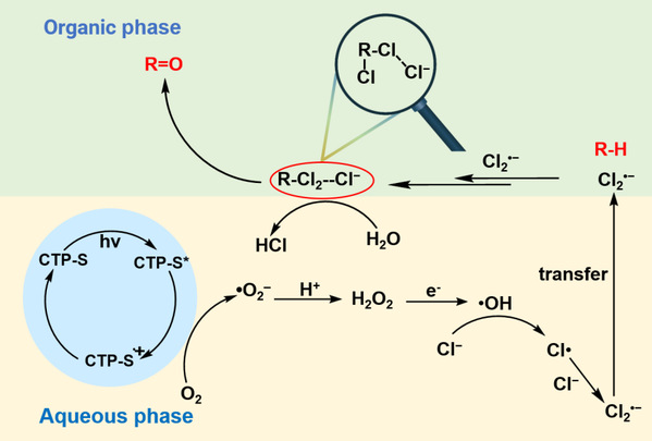 供体(噻吩)-受体(三嗪)结构赋予了CTP-S优异的光生电子-空穴分离能力,深度活化O2为Cl2•−(O2→H2O2→•OH→Cl•→Cl2•−)。在酸性-两相一体化体系(2 M HCl水相/甲苯有机相)中,甲苯转化速率达到16.94 mmol·g⁻¹·h⁻¹,苯甲醛选择性99.5%。闪光光解证实Cl2•−在340 nm处有特征吸收,寿命长达33.34 μs(远长于Cl•的<5 μs和•OH的~100 ns)。与Cl•相比,长寿命的Cl2•−能够更有效地连续活化C(sp3)-H生成不稳定的二氯中间产物,将二氯化与一氯化的动力学速率比提升2000倍,打破了传统二氯化动力学限制。这些活性中间体比稳定的二氯化合物更容易水解成醛类或酮类,有效避免了氯化副产物的产生。此外,酸性-两相一体化体系强化了Cl2•−介导的过程,抑制了产物过氧化。该体系对环己烷、乙苯、对二甲苯等多种底物均表现出高转化率和高醛/酮选择性,且无一氯代副产物。这是首次将Cl2•−应用于惰性C(sp3)-H键选择性制备醛/酮,为光生H2O2的深度原位利用开辟了新方向。