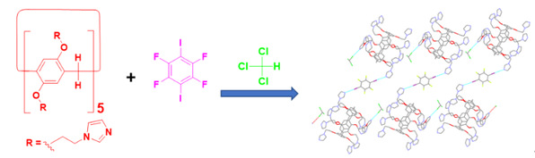(a) (b) Figure 3 (a) synthesis of prism[6]arene; (b) Cl-/Ag+ responsiveness of P6EtÉG [2]基于柱芳烃超分子聚合物的制备 超分子聚合物是超分子化学和传统的聚合物化学的结合,是由可逆的和定向的非共价相互作用保持在一起的相同或不同种类的单体组成的。在非共价键的响应性和可逆特性的基础上,超分子聚合物表现出独特而有趣的特性,如凝胶和自我修复,并已成为超分子化学和材料科学中最活跃的领域之一。氢键,π-π堆积相互作用,疏水相互作用和金属配体相互作用是四种常见的用于构筑超分子聚合物的非共价键相互作用。现在,作为超分子化学的重要组成部分,主客体之间的相互作用是在构建超分子聚合物中已经变得越来越普遍。 基于柱芳烃的主客体络合及卤键相互作用,本课题组发展了基于柱芳烃三维超分子聚合体系,具体如下:基于柱[5]芳烃/1,4-二咪唑丁烷、柱[6]芳烃/1,4-二叠氮双环[2.2.2]辛烷两种主客体络合体系,在1,4-二碘四氟苯形成的卤键协助下,成功构建了基于主客体络合、卤键及π•••π堆积的三维超分子络合体系(Figure 4a);在全烷基柱[5]芳烃/氯仿主客体络合体系下,加入1,4-二碘四氟苯,构筑了基于主客体络合、卤键及π•••π堆积的三维超分子络合体系(Figure 4b)。
