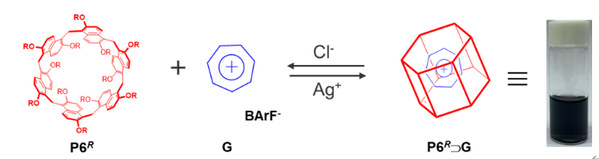 (a) (b) Figure 2 (a) pillar[4]arene[1]quinone; (b) pillar[4]arene[1]cis-diepoxy-p-dione 2020年,Carmine Gaeta等人基于2,6-二甲氧基萘,成功制备了一种新的大环主体分子‒棱柱芳烃。这种新的大环是通过三氟乙酸催化的傅克烷基化反应由1,5位亚甲基桥连的2,6-二甲氧基萘组成的,包括棱柱[5]芳烃和棱柱[6]芳烃。本课题组以柱芳烃作为主体大环分子,进一步开展了一系列研究:发展了以2,6二乙氧基-1,5-二甲氧甲基萘为原料,以对甲苯磺酸为催化剂的合成方法,在氯仿中以93%的产率成功得到了二乙氧基棱柱[6]芳烃,同时发现这种大环分子与金刚烷铵四(3,5-二(三氟甲基)苯基)硼酸盐在氯仿中的络合可以通过pH及Cl-/Ag+进行双重调控(Figure 3a);在合成丙基、丁基及异丁基棱柱[6]芳烃作为主体分子的基础上,选择卓鎓阳离子作为客体分子,发现其与棱柱[6]芳烃可以形成电荷转移(CT)络合物,相关吸收带在560 nm。同时,这种电荷转移(CT)络合物具有Cl-/Ag+刺激响应性,为接下来制备基于棱柱芳烃的光电材料奠定了基础(Figure 3b)。