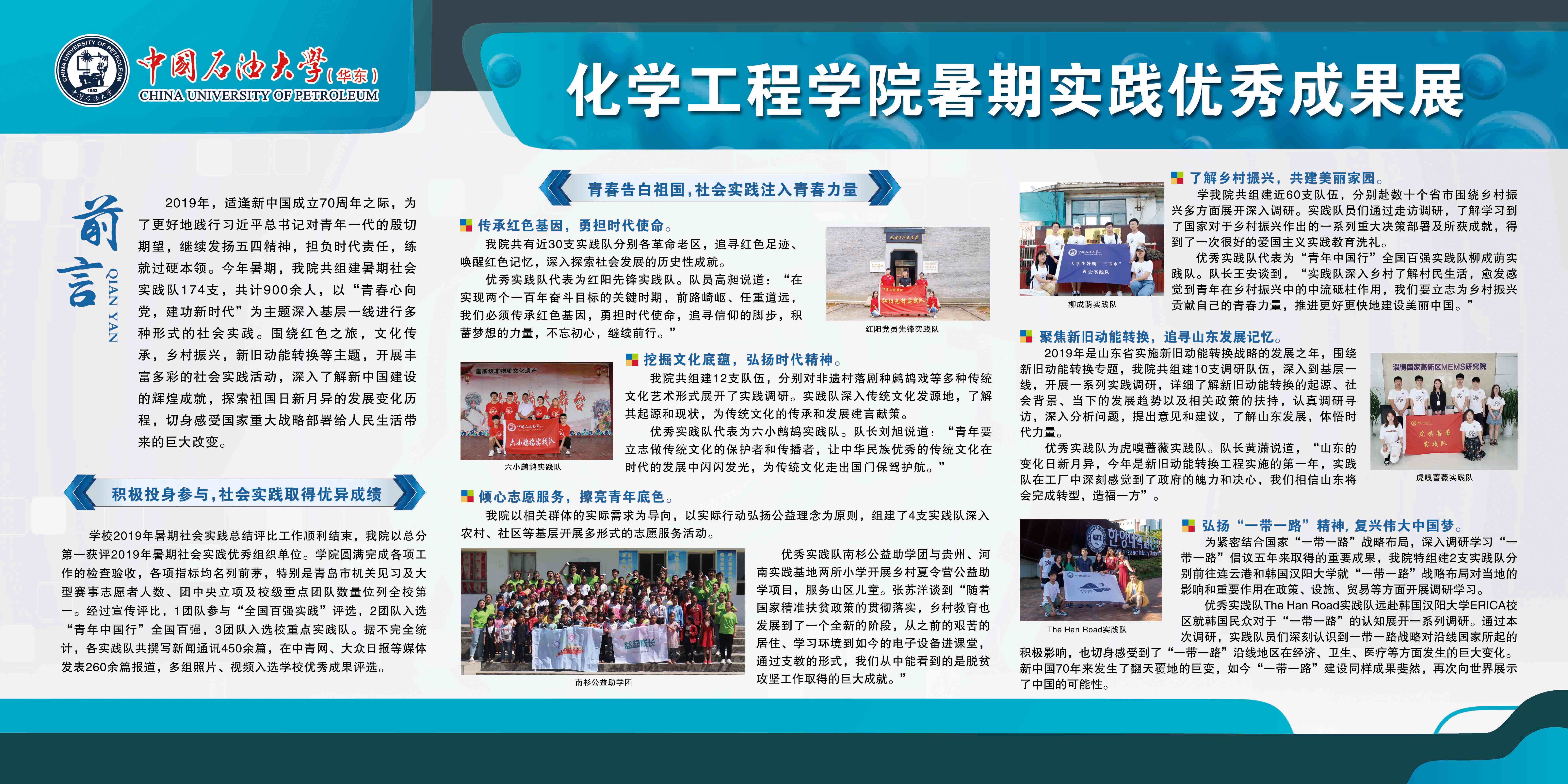 化工学院2018年暑期实践紧紧围绕理论普及、红色教育、国情社情、依法治国、教育关爱、美丽中国、创新创业、优秀校友八个重点项目,改革开放四十周年、乡村振兴战略、新旧动能转换三个专题调研项目,努力扩大活动覆盖面、提升活动实效性,深入推动我院学生在社会实践活动中“丰富阅历,磨练意志,增长才干”。坚持校内与校外相融、城市与乡村并存、国内与国际同步、集中与分散相应、长期与短期并举的做法,从而保证了社会实践阵的广泛性和方式的灵活性。社会实践活动注重专业服务地方、与新农村建设相结合、与青年志愿者服务相结合。开展多种多样的实践活动,服务社会,服务大众,成长自我,并对实践活动进行总结。保证了我院学生社会实践既深入扎实又广泛受益。